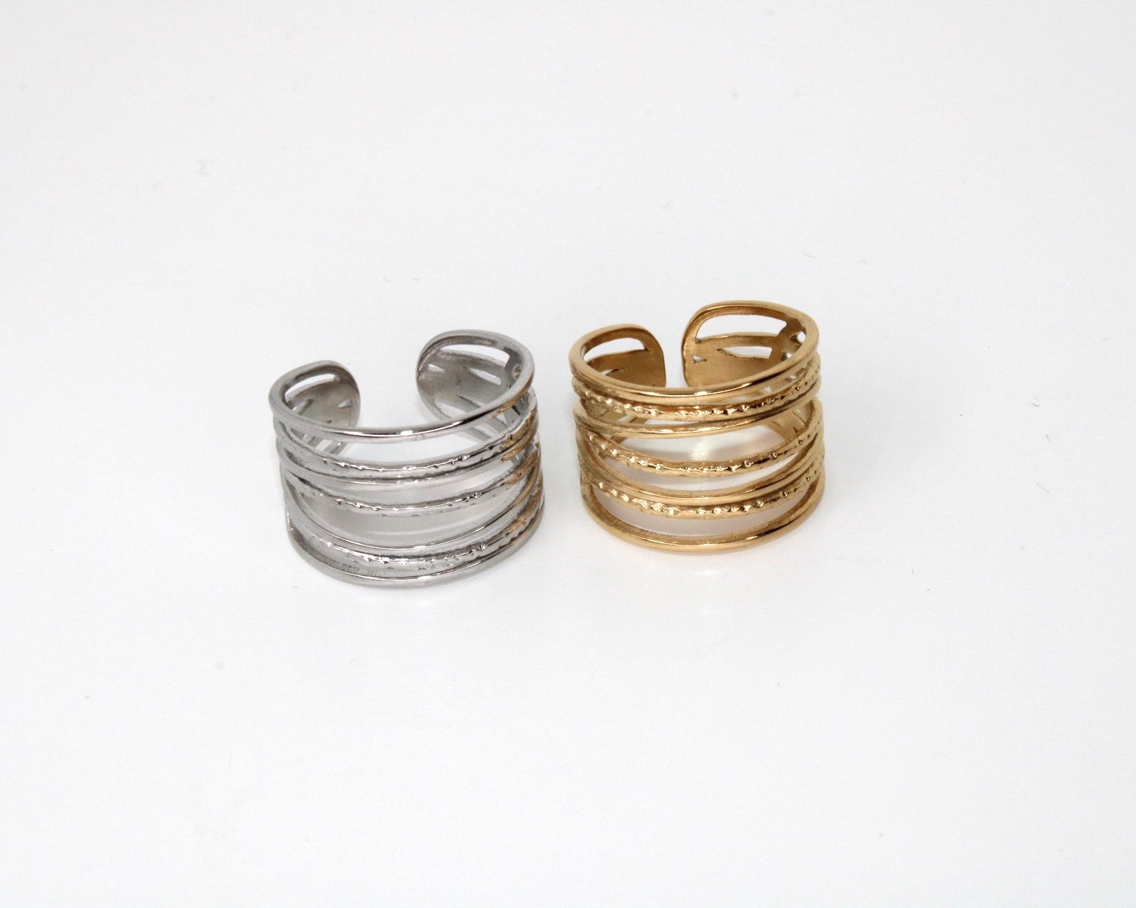 Sophistiquée et contemporaine, la bague Julie séduit par son design de sept anneaux ajourés et entrecroisés , dont trois texturés pour un subtil jeu de relief et de lumière. Conçue en acier inoxydable, elle allie résistance, éclat et confort. Ajustable, elle s'adapte parfaitement à votre doigt pour un style affirmé et raffiné.