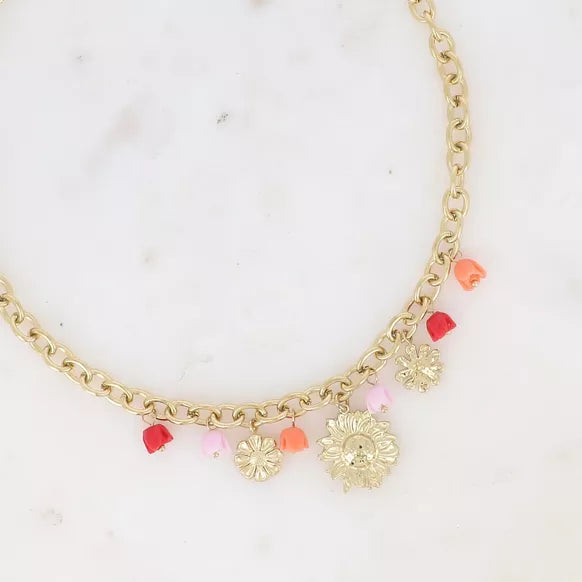 Collier sur chaîne en acier inoxydable composé d'une maille aux anneaux ovales épais embellie par des breloques florales, en acier et en acétate.