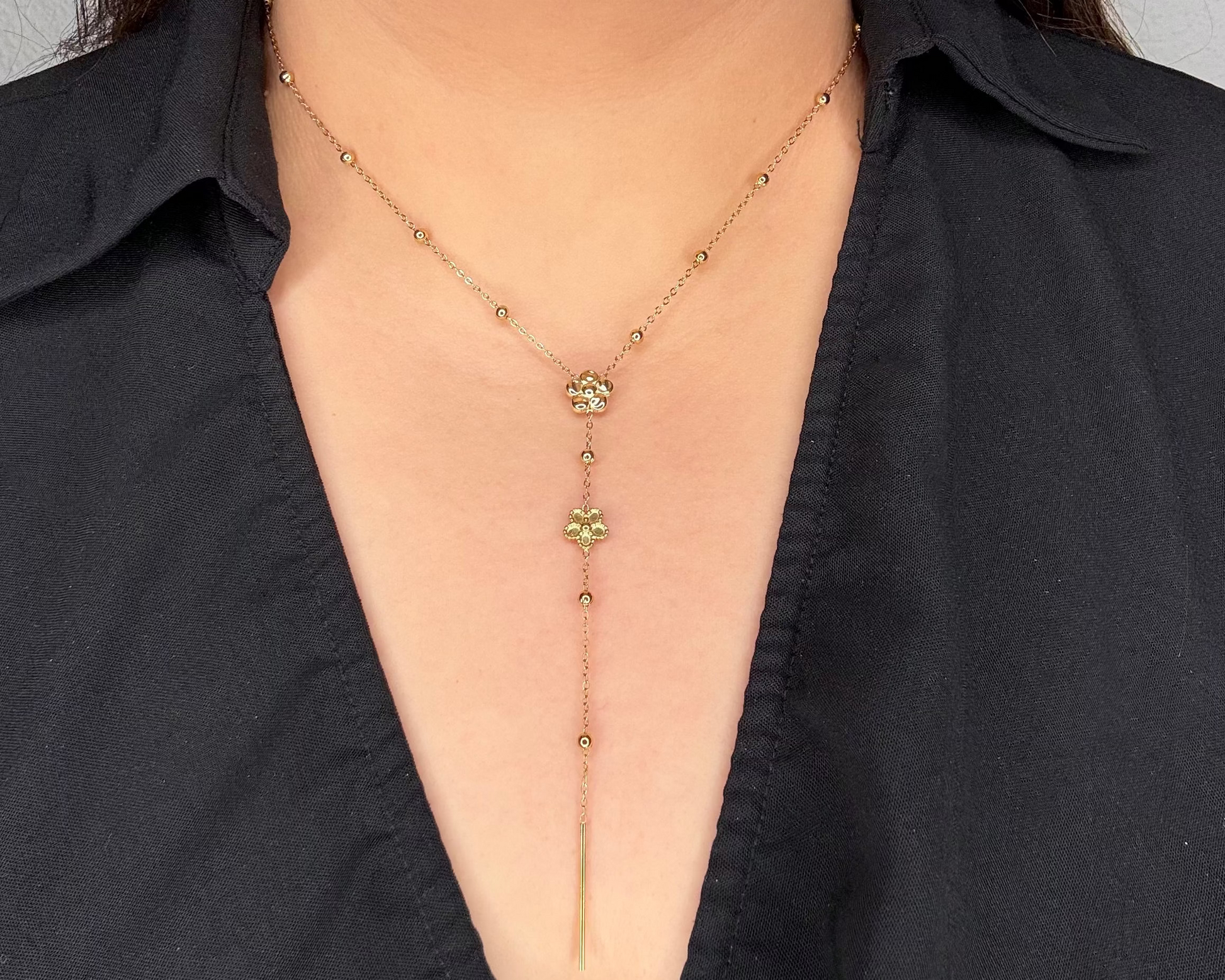 Un bijou plein de charme : le collier Rosalie séduit par son design en Y, ponctué de délicates fleurs et de billes scintillantes. Confectionné en acier inoxydable, il allie élégance, légèreté et brillance durable. Parfait pour sublimer vos tenues avec une touche féminine et raffinée.