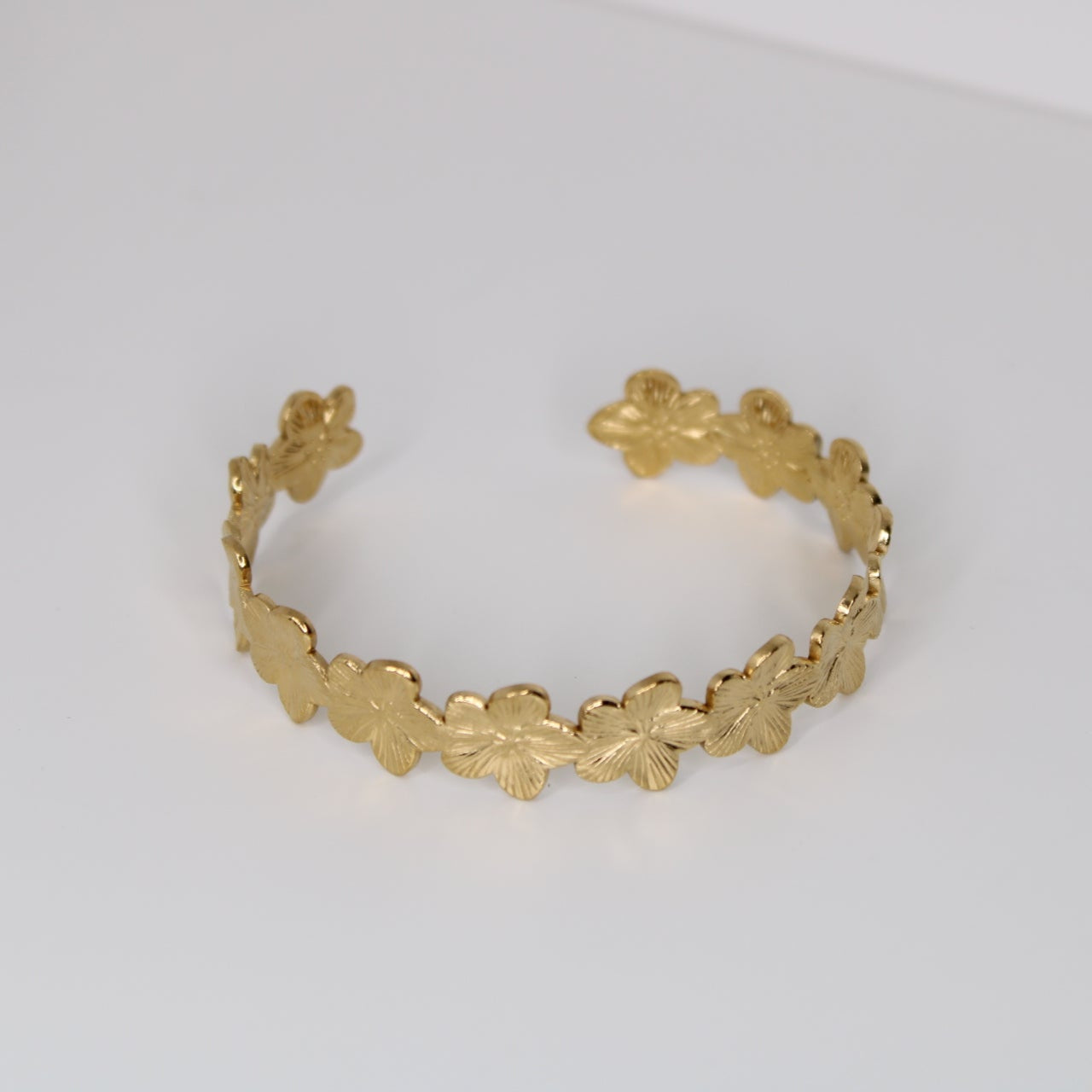 Ce bracelet jonc en acier inoxydable doré est orné d'une fleur finement sculptée , symbole de féminité et de douceur.